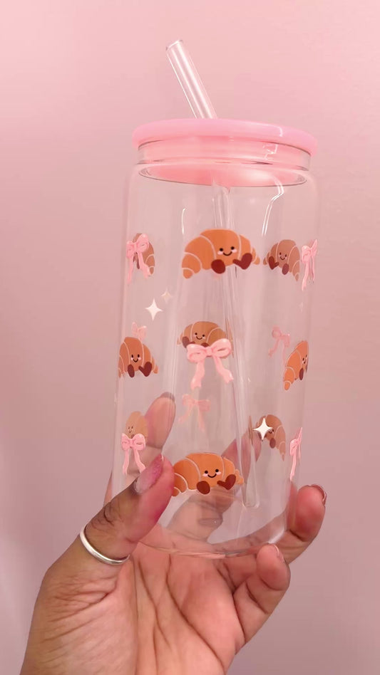 Pretty Little Croissants Glass Cup | 16oz Glass Cup with Lid and Straw