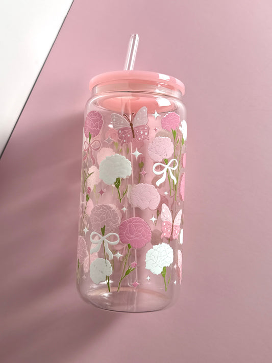 Pink Carnation Glass Cup | 16oz Tumbler with Plastic Lid & Glass Straw