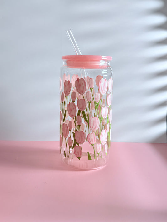 Tulip Field Glass Cup | 16oz Tumbler with Plastic Lid & Glass Straw