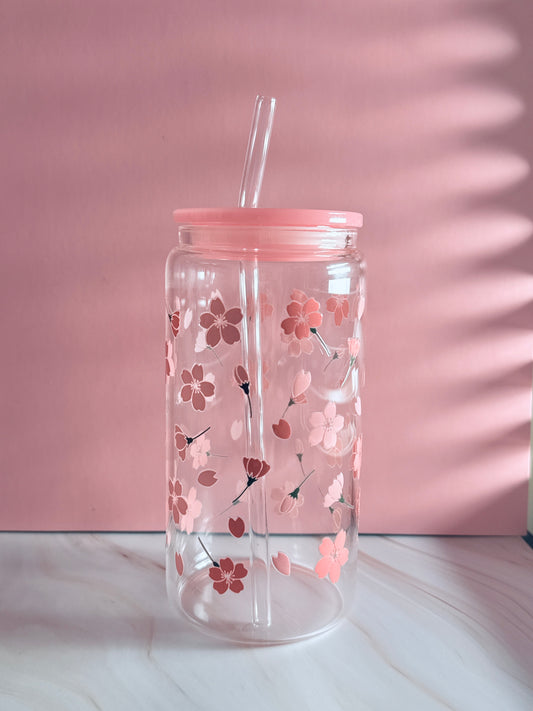 Sakura Glass Cup | 16oz Tumbler with Plastic Lid & Glass Straw