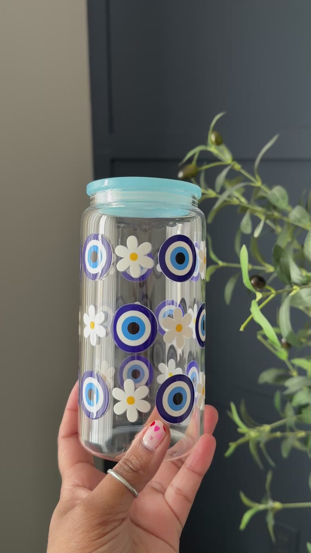Sip with style and protection. This 16oz glass tumbler features a charming evil eye and daisy design that brings positive energy to your daily hydration routine.