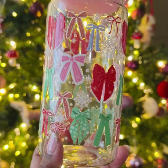 Crafted from premium glass, this 16oz tumbler features a delightful festive bow design that brings warmth and cheer to your daily rituals. Whether you're sipping morning coffee, afternoon tea, or evening cocoa, the playful bow pattern adds a touch of celebration to every moment.