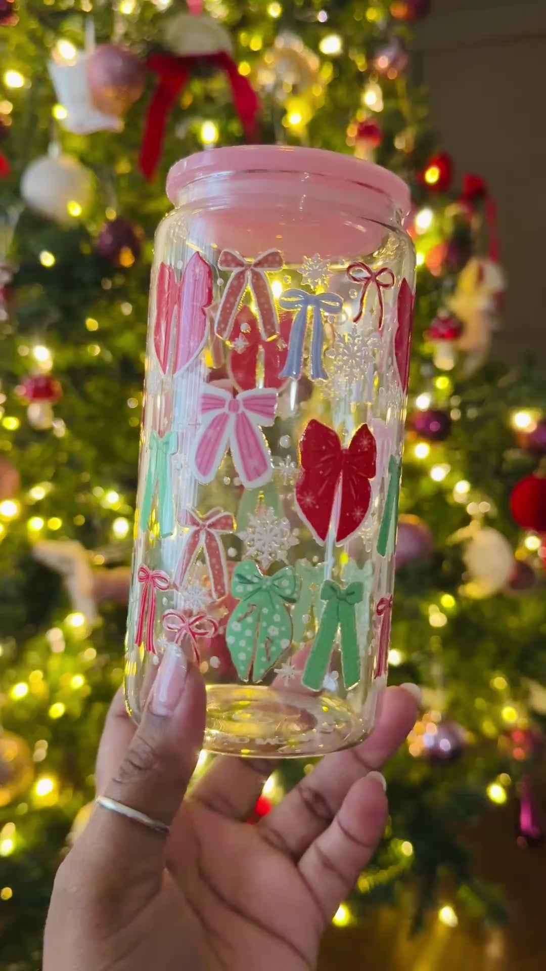 Festive bows Cup- 16oz glass tumbler with plastic lid