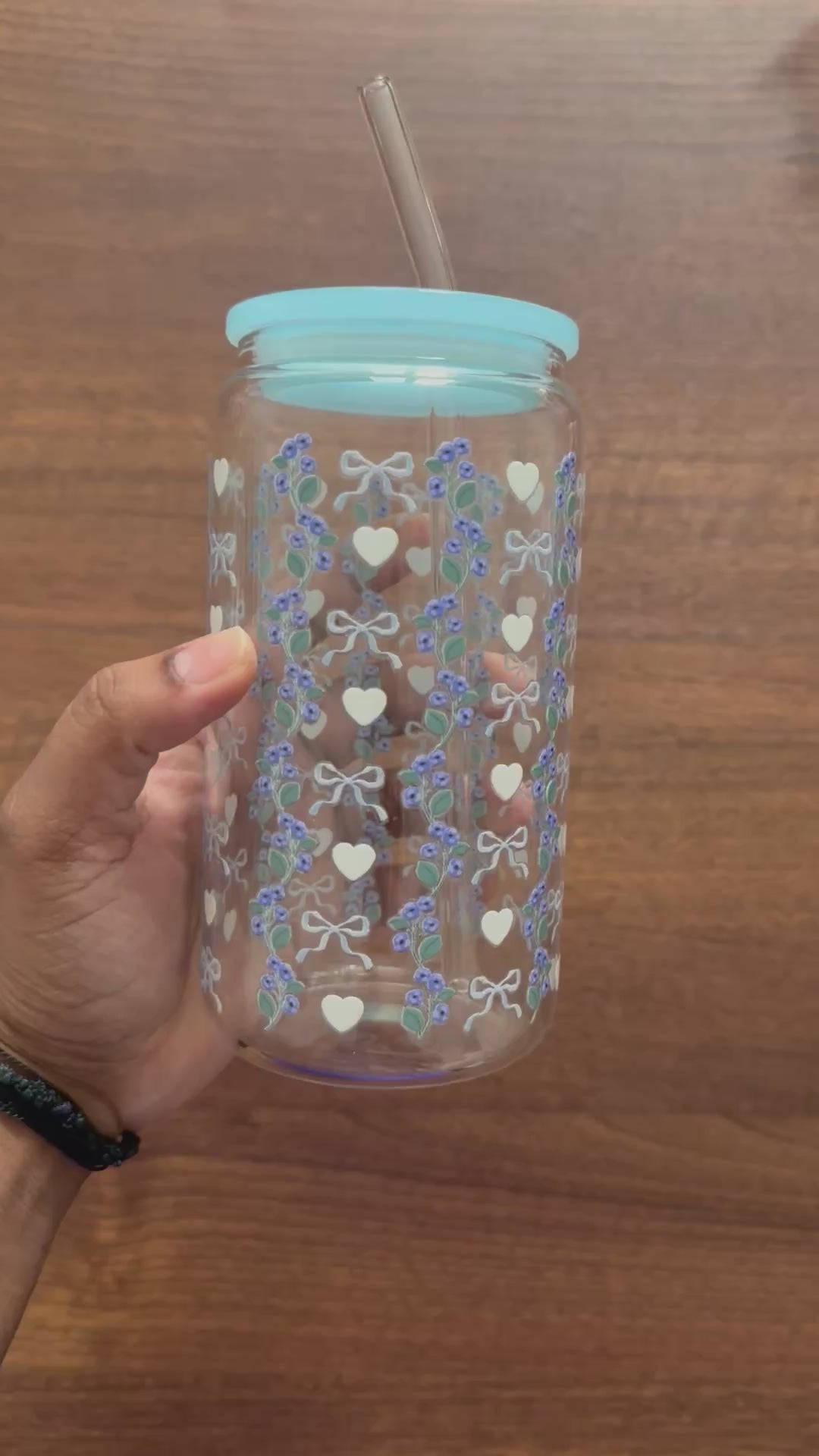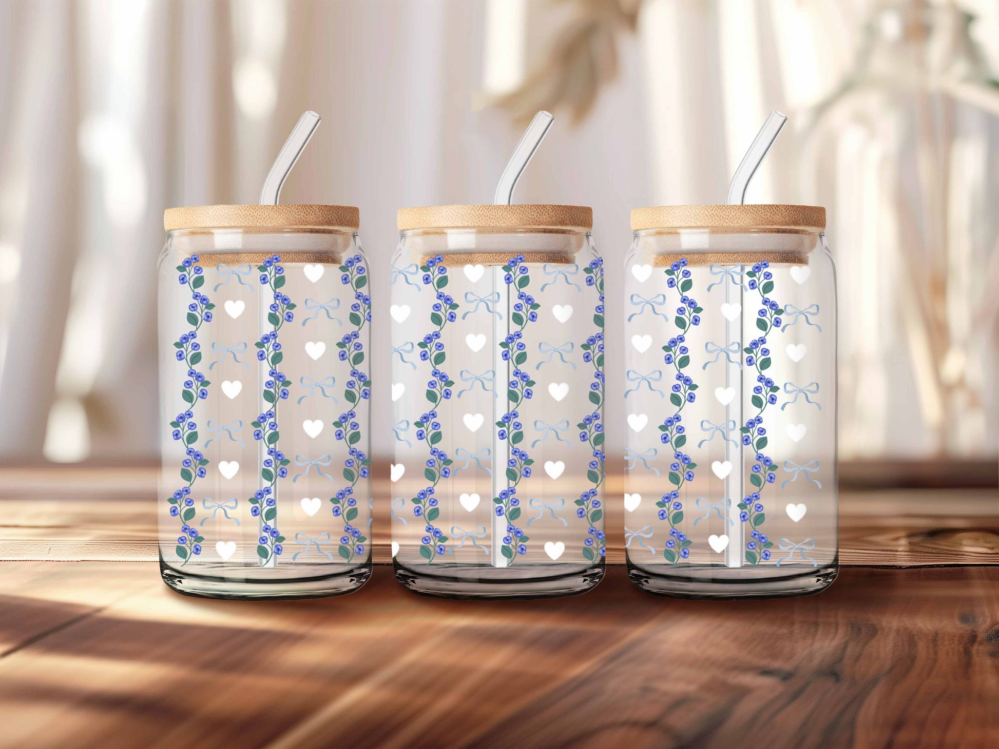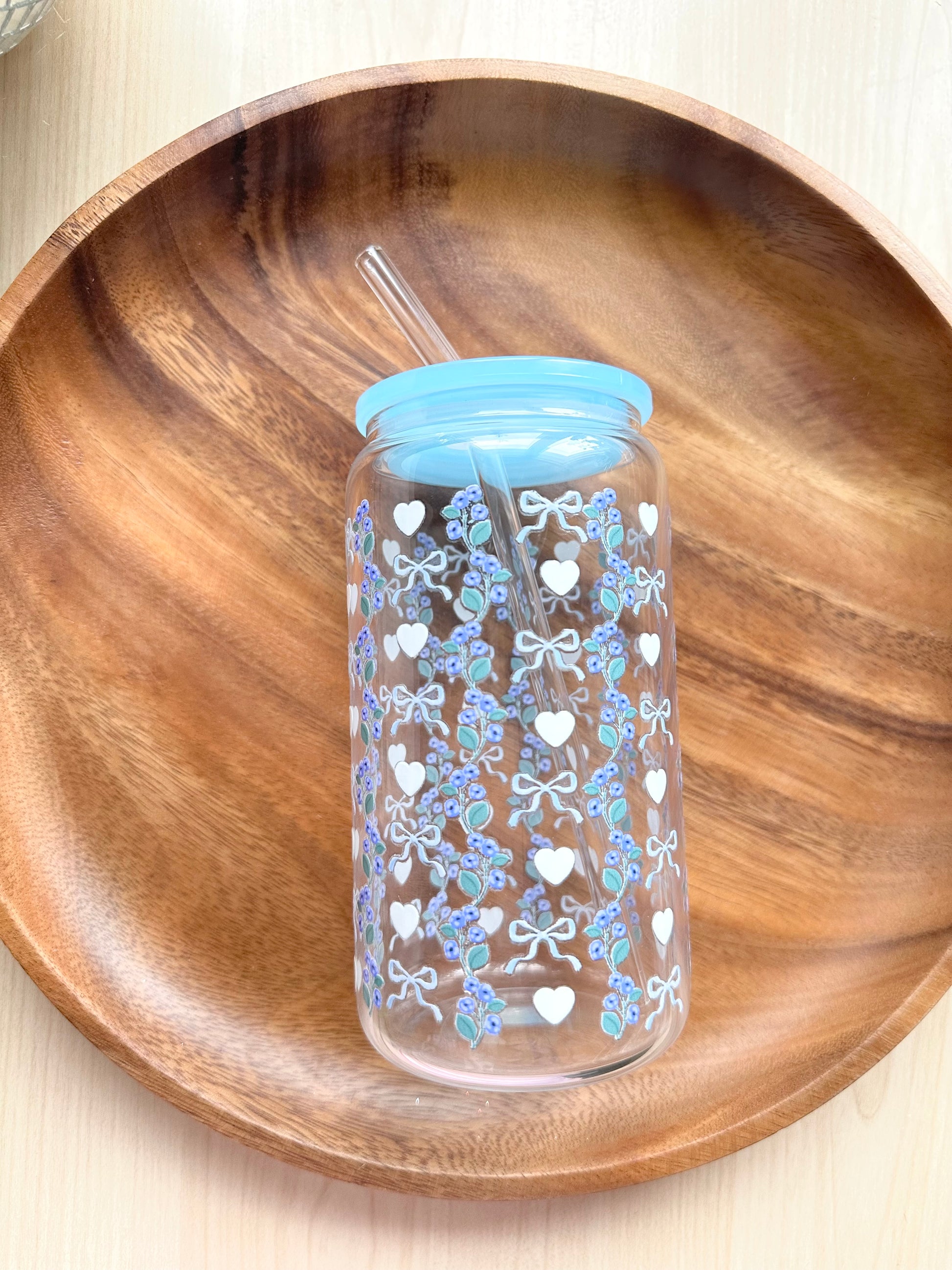 Blue Coquette Floral | Glass Cup with Plastic/ Bamboo Lid & Glass Straw