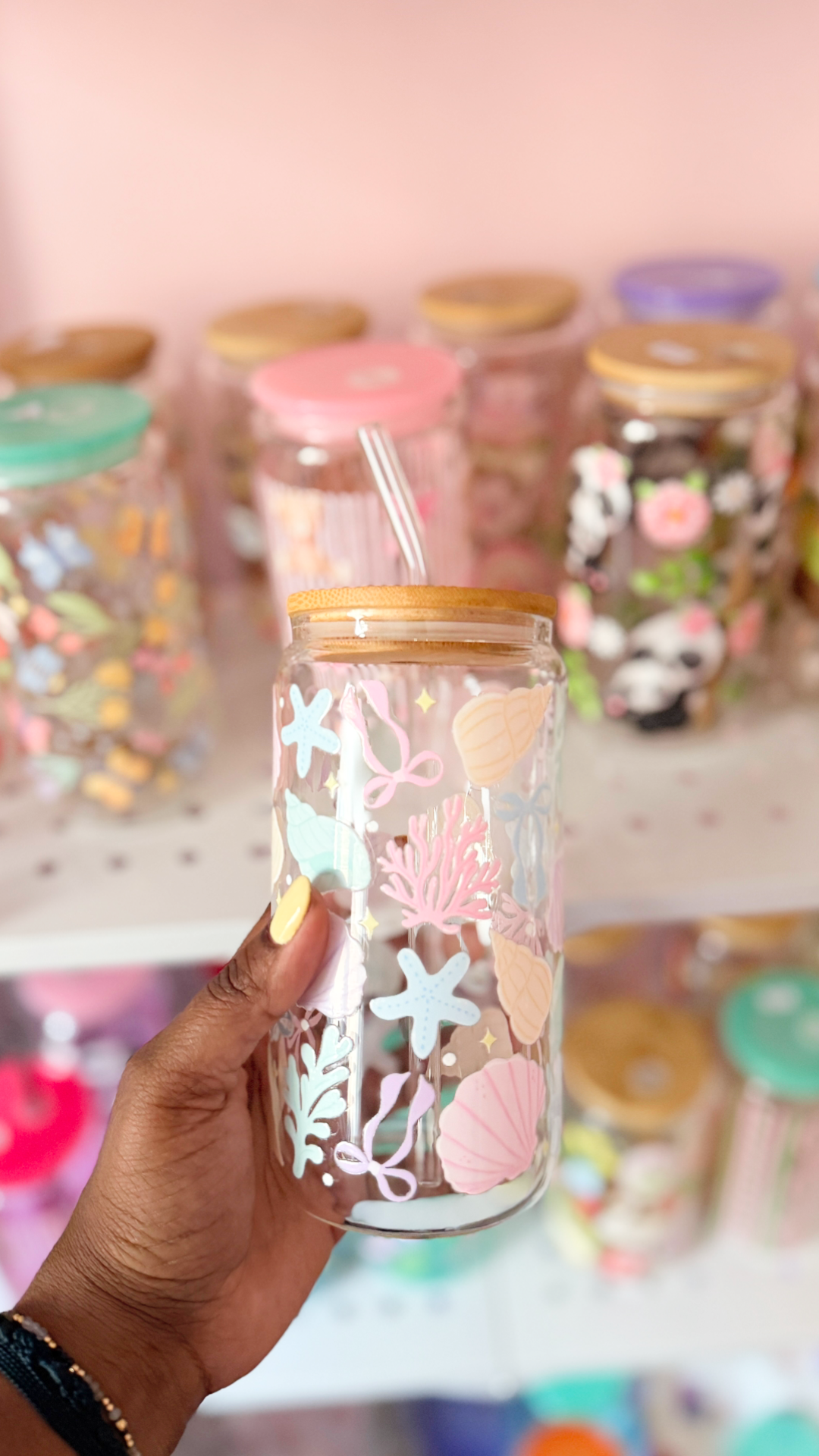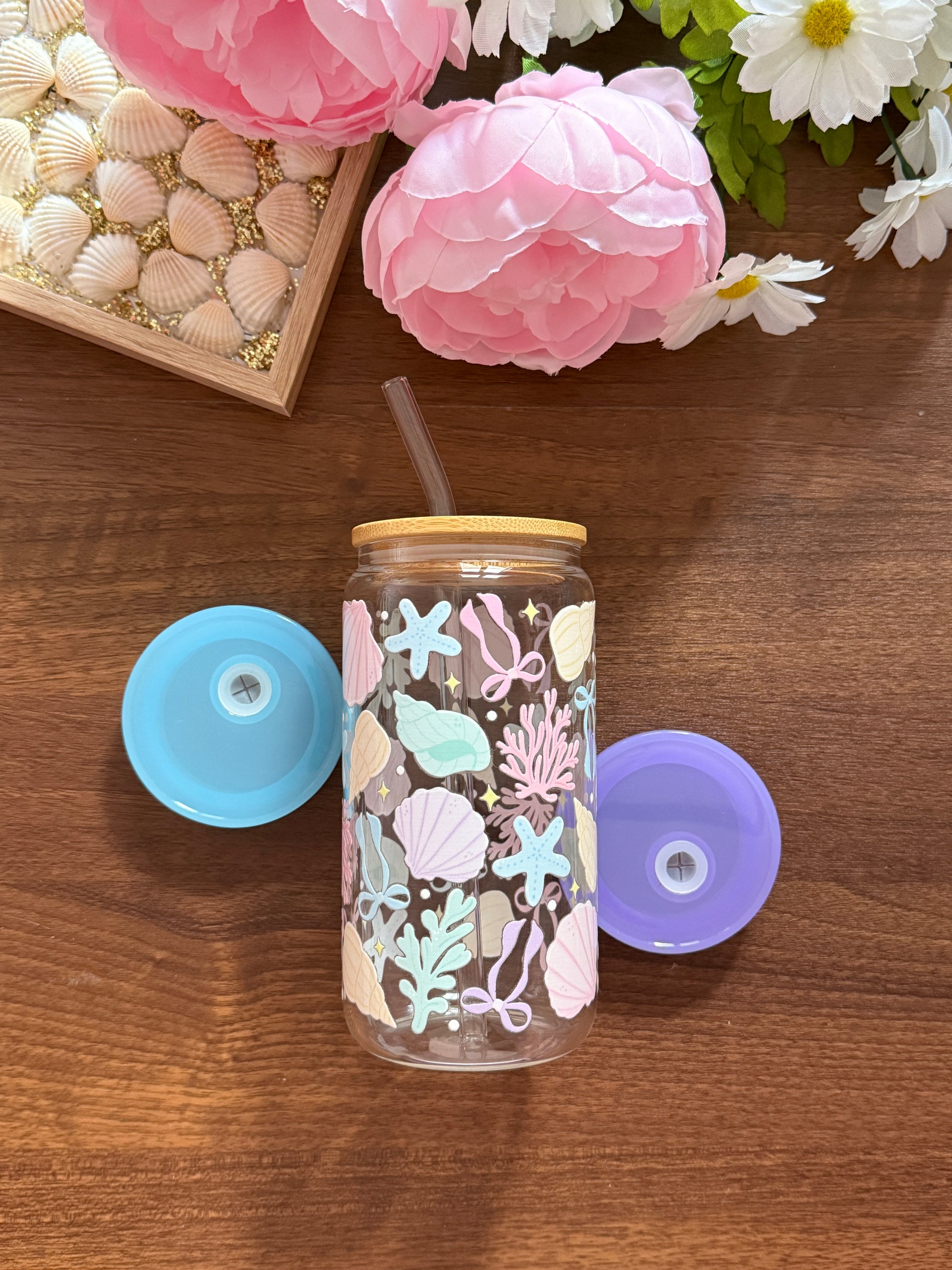 Coquette Sea Shell Cup | Glass Cup with Plastic/ Bamboo Lid & Glass Straw
