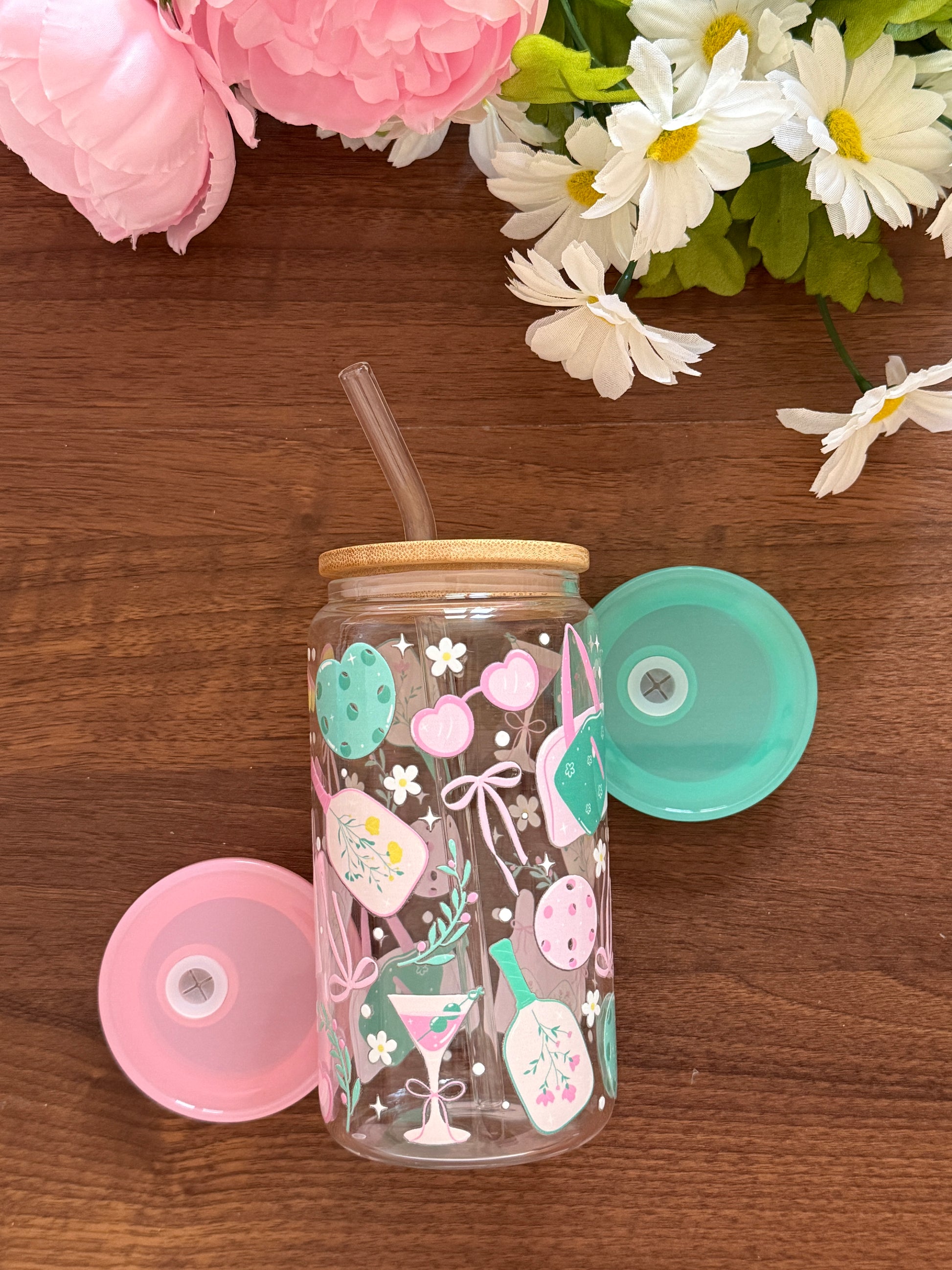 16oz glass cup with bamboo lid and straw!