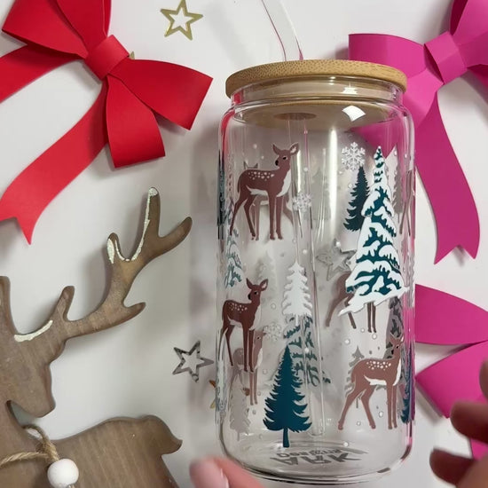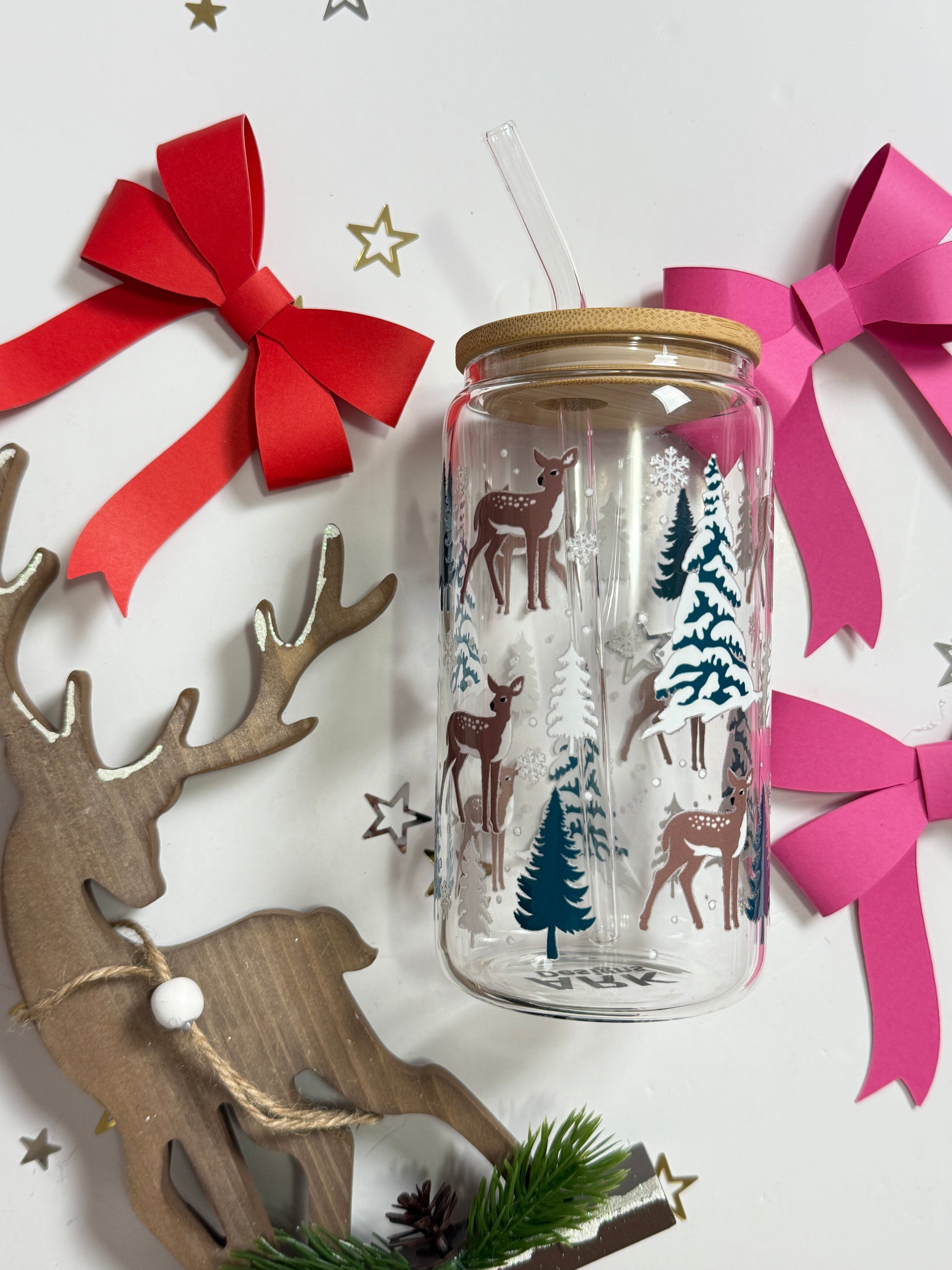 Embrace festive cheer while staying true to your eco-conscious values. This 16oz glass tumbler features a charming doe design that brings woodland elegance to your daily routine—whether you're enjoying your morning coffee, afternoon iced tea, or evening mocktails.
