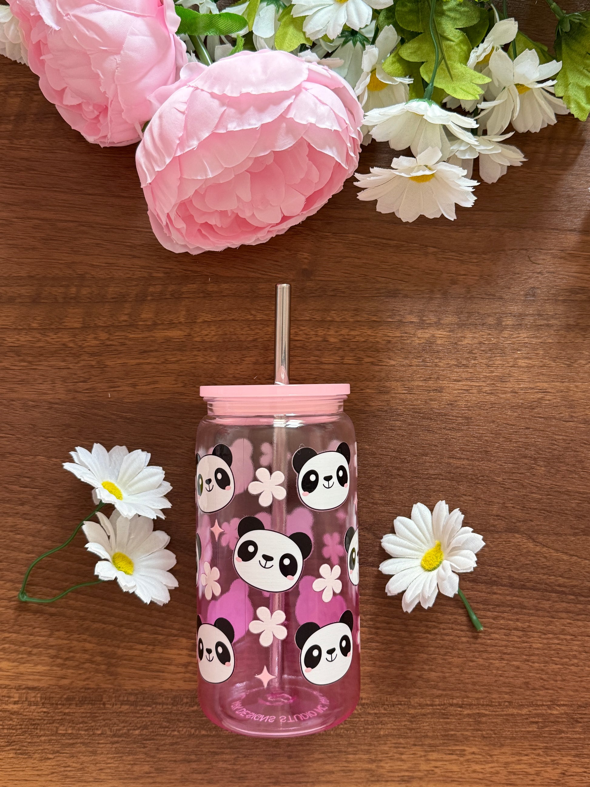 Panda Daisy Cup | Plastic Cup with Plastic Lid & Stainless Steel & Plastic Straw