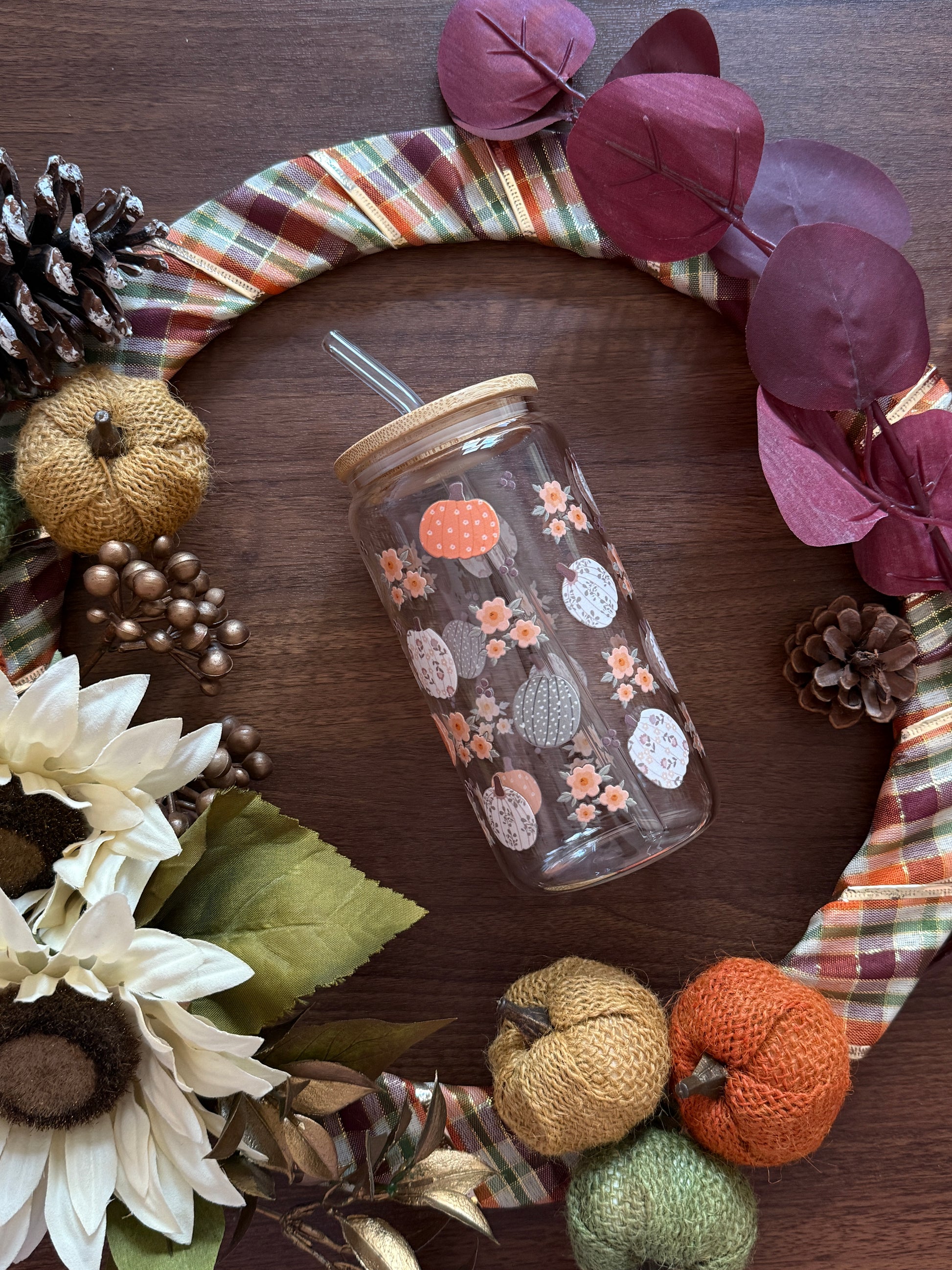 Pumpkin Patch Glass Cup - 16oz Tumbler with Bamboo Lid & Glass Straw