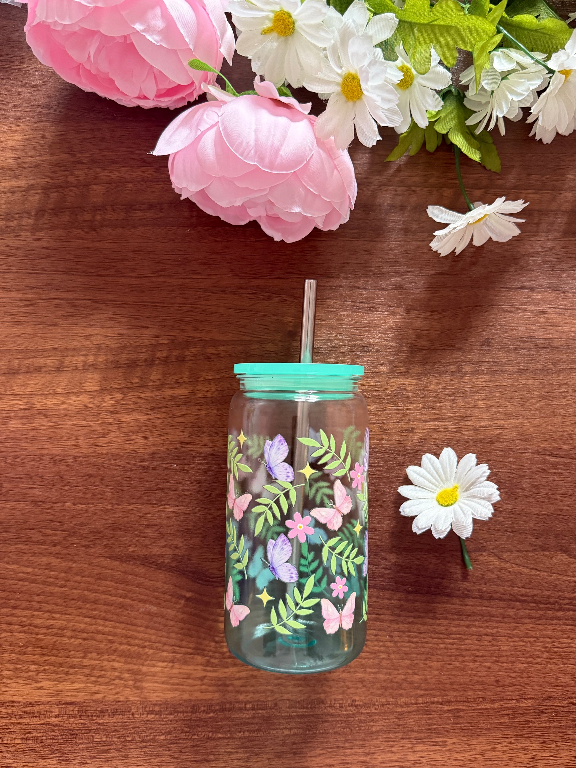 Spring Butterflies Plastic Cup | Plastic Cup with Plastic Lid & Stainless Steel & Plastic Straw